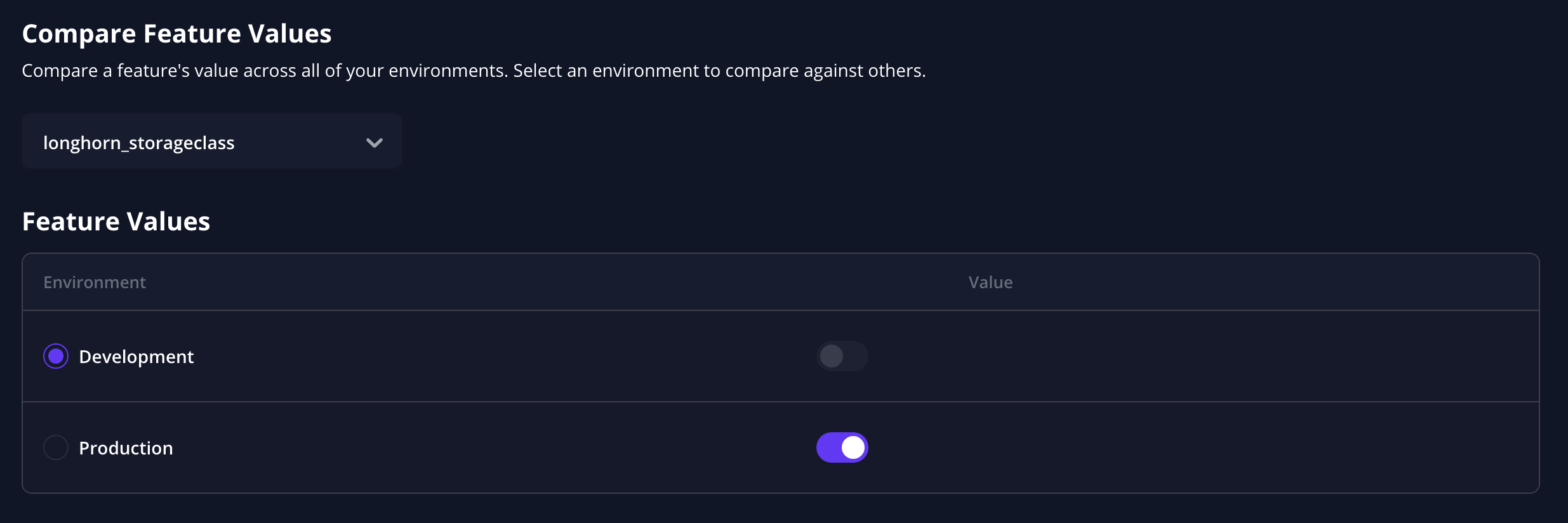 As an example, one of the features I have configured is using Longhorn as my default storage class. For some background longhorn is a distributed storage solution for bare metal Kubernetes essentially allowing you to use your node’s storage like cloud native storage. The other important detail is I run my Kubernetes cluster in a co-location and I don’t currently have the budget to run a dedicated “staging” cluster. So when I need to develop and test things I usually spin up a kind cluster on my laptop and work from there. One issue with this is Longhorn doesn’t work so well on a kind cluster because of some limitations with kind so I needed a way that when I spin up my deployments on my laptop it will use the default storage class but in production it will use longhorn. FlagOps was able to solve this for me pretty easily.